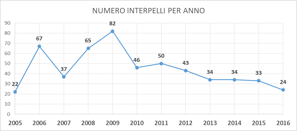 Già negli ultimi anni si è ravvisata una riduzione degli interpelli forniti dal Ministero del Lavoro (vedasi la tabella sottostante).