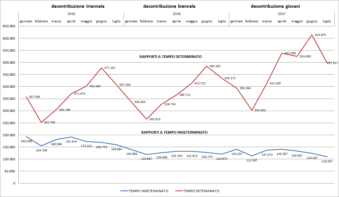 E’ visibile una diminuzione sensibile dei rapporti a tempo indeterminato (in rosso) ed una crescita esponenziale dei contratti a termine (in azzurro). Infatti, nei primi 7 mesi si è passato da più di 1.200.000 assunzioni a tempo indeterminato del 2015 a poco meno di 900.000 del 2017; viceversa, le assunzioni a termine sono passate da poco più di 2. 570.000 del 2015 a 3.280.000 del 2017.