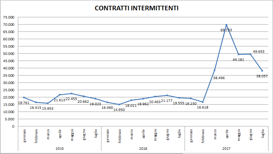 Più che raddoppiati i contratti intermittenti che, sempre con riferimento ai primi 7 mesi dell’anno (gennaio-luglio), sono passati dai 135.000 del 2015 ai 281.000 del 2017. Questo aumento risente dell’abrogazione del Lavoro Accessorio (avvenuto nel marzo del 2017) e del ridotto appeal delle nuove Prestazioni Occasionali.