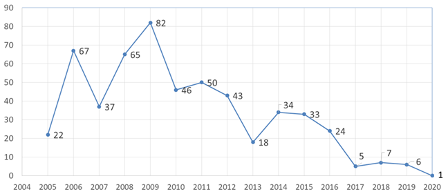 Questo è il grafico relativo al numero di interpelli a cui il Ministero del Lavoro ha risposto dal 2004. Come potete notare, dal 2017 (anno di nascita dell’Ispettorato Nazionale del Lavoro) c’è una impressionante riduzione degli interpelli, fino ad arrivare al 2020 con la pubblicazione di un solo interpello.