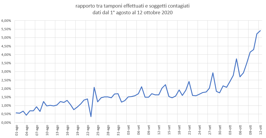 Il numero dei contagi giornalieri va sempre rapportato al numero di tamponi effettuati. Il grafico evidenzia proprio la percentuale di soggetti positivi al Covid-19 per ogni 100 tamponi effettuati (periodo di rilevazione: dal 1° agosto al 12 ottobre 2020).
