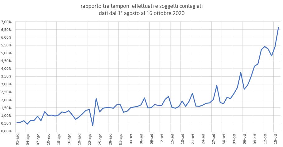 Il numero dei contagi giornalieri va sempre rapportato al numero di tamponi effettuati. Il grafico evidenzia proprio la percentuale di soggetti positivi al Covid-19 per ogni 100 tamponi effettuati (periodo di rilevazione: dal 1° agosto al 16 ottobre 2020).