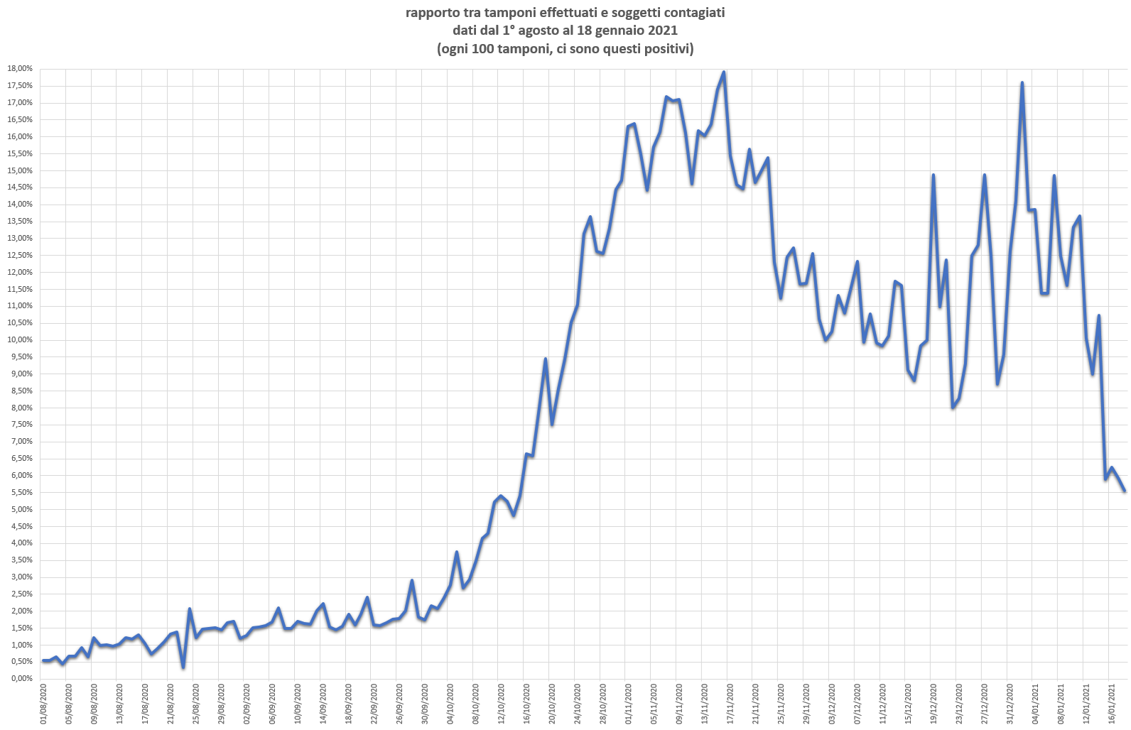 Il 18 gennaio 2021 sono stati fatti 158.674 tamponi, dei quali 8.824 sono risultati positivi (percentuale del 5,56%). I deceduti sono stati 377.