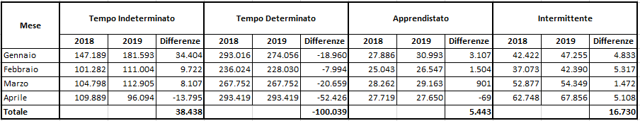 Nei primi 4 mesi del 2019 si nota un aumento di 38mila assunzioni a tempo indeterminato a fronte di una riduzione di 100mila rapporti a tempo determinato. Aumentano anche i rapporti di lavoro in Apprendistato di oltre di 5mila unità, così come i rapporti intermittenti, di quasi 17mila unità.