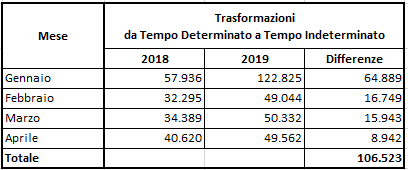 Nei primi 4 mesi del 2019 aumentano di oltre 106mila unità le trasformazioni da rapporto a termine a rapporto di lavoro in tempo indeterminato.