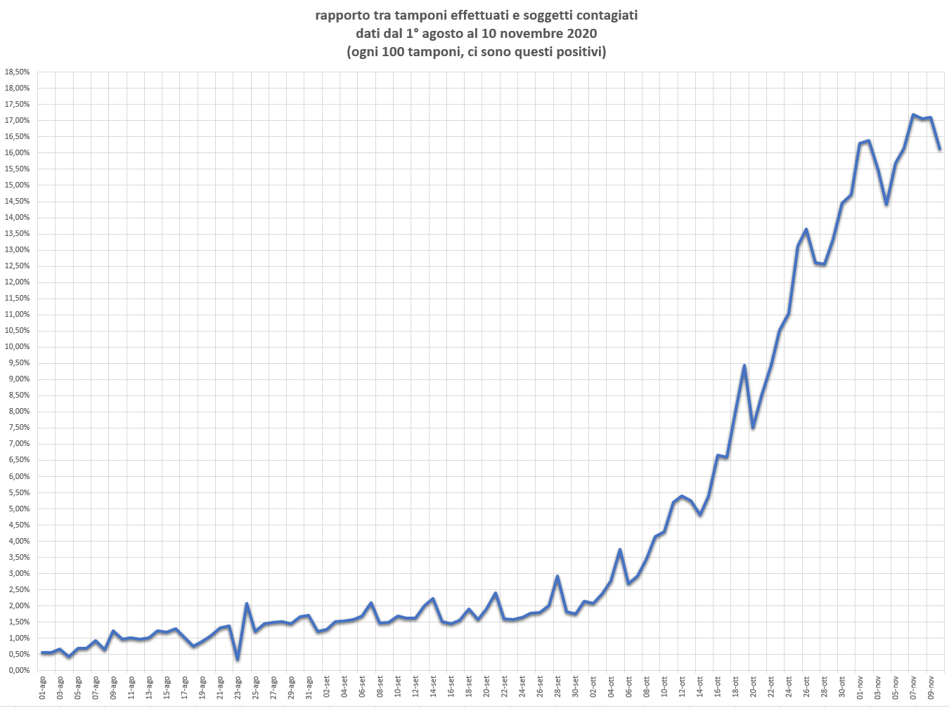 Il numero dei contagi giornalieri va sempre rapportato al numero di tamponi effettuati. Il grafico evidenzia proprio la percentuale di soggetti positivi al Covid-19 per ogni 100 tamponi effettuati (periodo di rilevazione: dal 1° agosto al 10 novembre 2020).