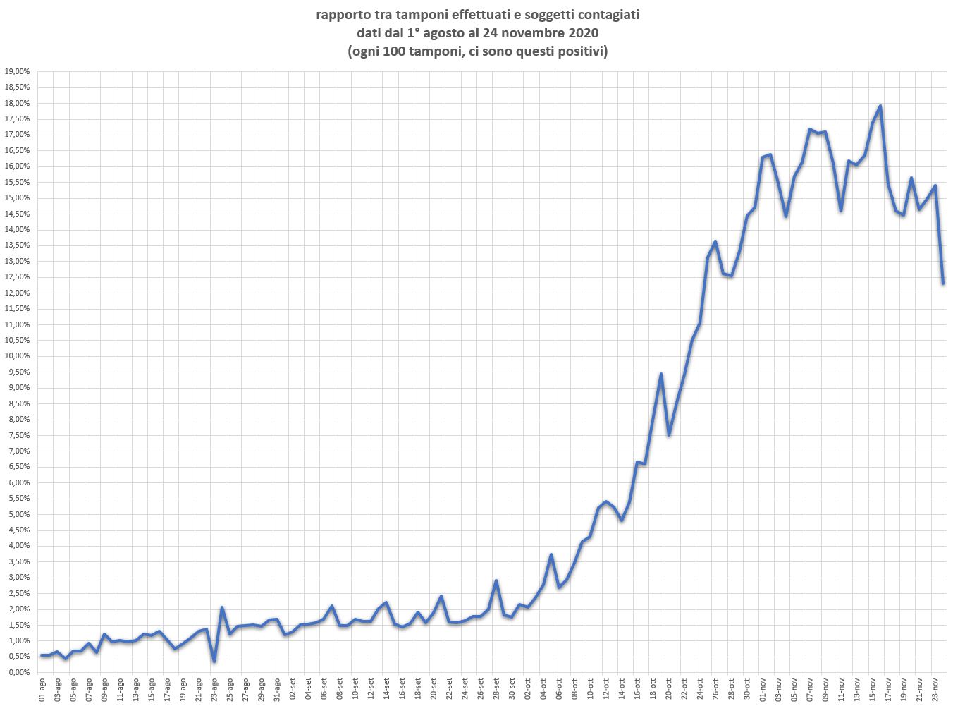 Il numero dei contagi giornalieri va sempre rapportato al numero di tamponi effettuati. Il grafico evidenzia proprio la percentuale di soggetti positivi al Covid-19 per ogni 100 tamponi effettuati (periodo di rilevazione: dal 1° agosto al 24 novembre 2020).