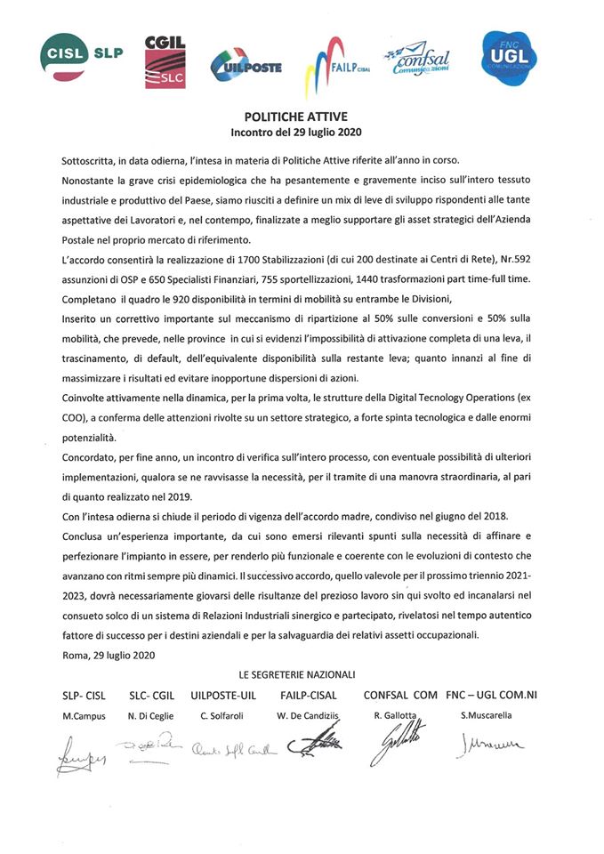 In data 29 luglio 2020, Poste Italiane S.p.A. e le parti sociali (SLC-CGIL, SLP-CISL, UILposte, FAILP-CISAL, CONFSAL, FNC UGL), hanno sottoscritto una accordo per le Politiche Attive per l’anno 2020.