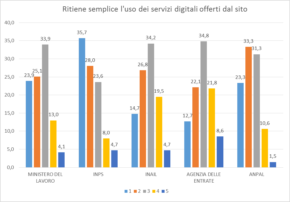 Abbiamo chiesto agli intervistati se ritenevano semplice l’uso dei servizi digitali offerti dai principali siti delle Pubbliche Amministrazioni che trattano la materia Lavoro (Ministero del Lavoro, INPS, INAIL, Agenzia delle Entrate e ANPAL).