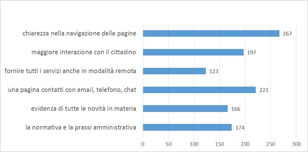 Viene richiesto agli intervistati quali debbano essere i cardini di un buon sito di una Pubblica Amministrazione. Le risposte (multiple) evidenziano la necessità di avere un miglior menu di navigazione e la possibilità di interagire, al fine di ricevere le informazioni necessarie agli adempimenti di competenza.